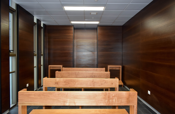 El recinto estará ubicado en el Piso 2° del futuro establecimiento, en un área cercana a la Hospitalización Adulto, y cuenta con aislamiento acústico, luz natural, 5 bancas y 2 reclinatorios.