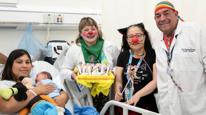 Con mucha alegría, las pacientes, familiares y funcionarias de la Maternidad y el Bloque Médico Quirúrgico del Hospital Claudio Vicuña recibieron a nuestra unidad de Humanización y los payasos hospitalarios Rainbow Clown, quienes realizaron una especial visita a los servicios en el marco del Mes de la Mujer, haciéndoles entrega de un presente y compartiendo con cada una de ellas un grato momento de risas y abrazos.