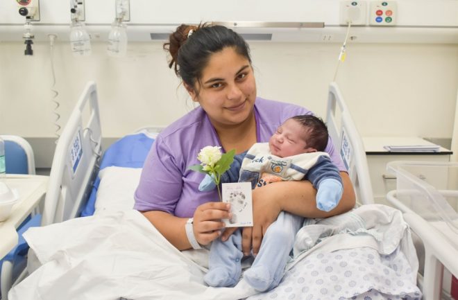 Una tarjeta con la impresión de pies de sus bebés fue el regalo que el equipo de la Maternidad del Nuevo Hospital Claudio Vicuña preparó para todas las madres del servicio el día de ayer, quienes recibieron con mucha alegría y emoción este recuerdo de las huellitas de los primeros días de vida de sus hijos e hijas.